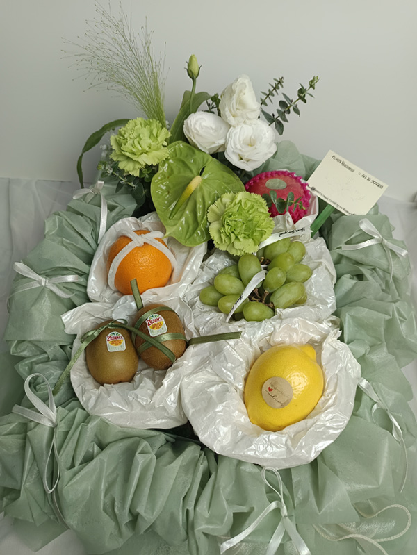 Indulge in the elegance of our “Parisian Promenade” fruit and flower basket, a delightful combination of fresh fruits and timeless blooms.