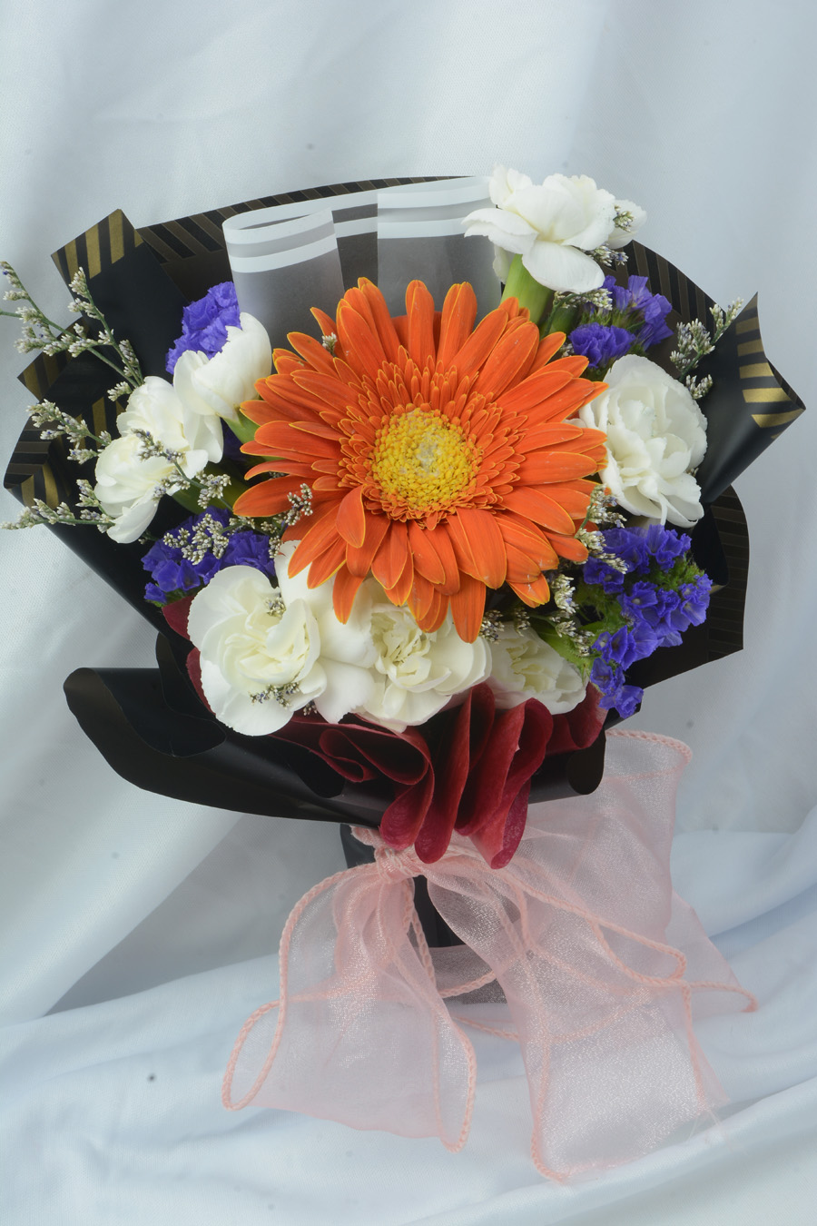 Sometimes, simplicity speaks volumes. The Solitaire Daisy is a striking hand bouquet that celebrates the uncomplicated beauty of a single bloom, presented with high-contrast elegance for maximum impact.
