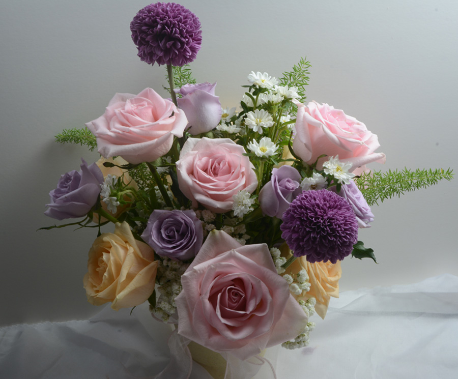 Interspersed amongst the roses are ethereal wisps of baby’s breath, creating a soft, cloud-like embrace, while playful purple pom-poms add a delightful pop of vibrant color and unique texture. The combination evokes the serene yet radiant beauty of dusk, where colors softly merge and glow. It’s an ideal gift to convey warmth, admiration, and a touch of magical allure.